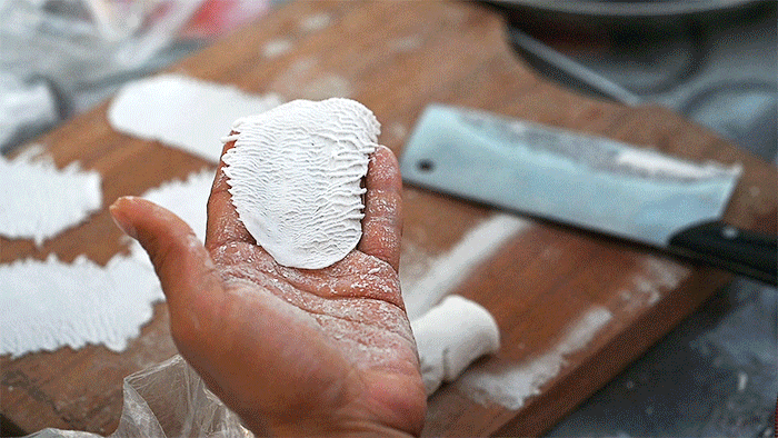 在恩平的街头巷尾,喜欢品尝牛脚皮的人群当中,有貌美的姑娘,有新潮的小伙,有中年的夫妇……牛脚皮其实就是牛脚跟上的肉茧,因为长年累月的行走而形成。烹制后的牛脚皮看似去过油的猪皮冻,口感爽脆弹牙,有如牛筋,稍带软绵,却又有点爽韧,吃后回味醇厚,还带着牛肉特有的香气。曾有一班老外到访恩平,起初他们对这盘白色牛脚皮不以为意,但吃下后,都纷纷竖起了大拇指,都说“Delicious(美味)”“Distinctive(有特色)”。【第十五怪:鱼皮做饺真趣怪】