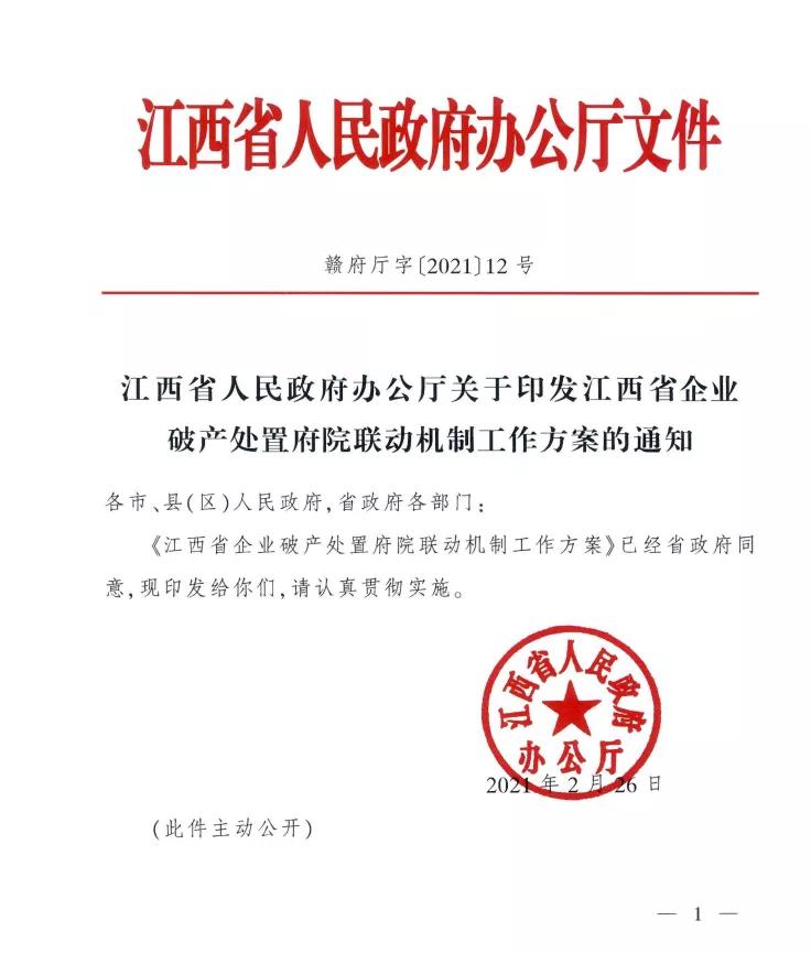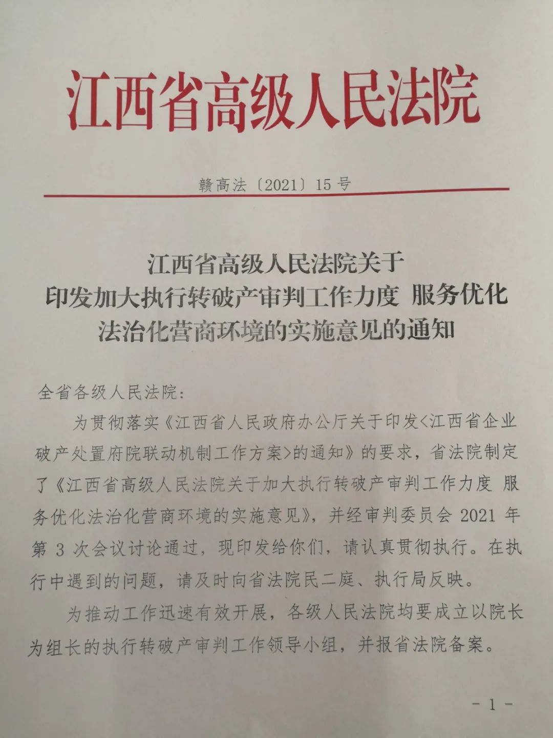 <江西省企业破产处置府院联动机制工作方案>的通知》,印发《江西省高级人民法院关于加大执行转破产审判工作力度 服务优化法治化营商环境的实施意见》。江西省企业破产处置府院联动机制工作方案>