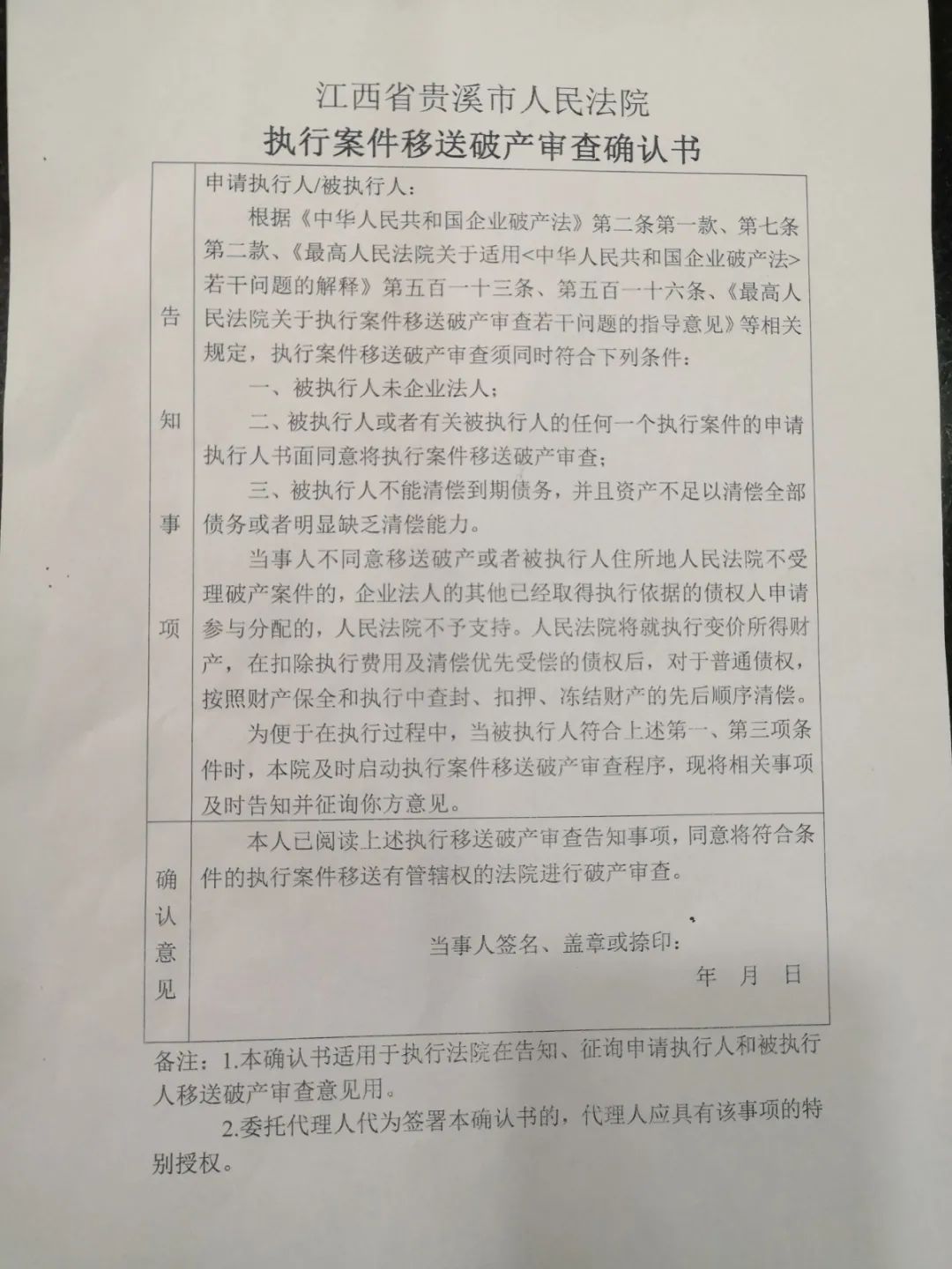 为了贯彻落实好上述两个文件精神,迅速推动“执转破”工作有效开展。贵溪法院创新优化工作流程,制作发放《执行案件移送破产审查确认书》,将“当事人书面同意确认”等程序性告知、释明工作前移,即在立案阶段,提前告知当事人如符合执行移送破产条件,本院可及时启动“执转破”审查程序,并征询当事人意见,当事人知情同意后签字确认。