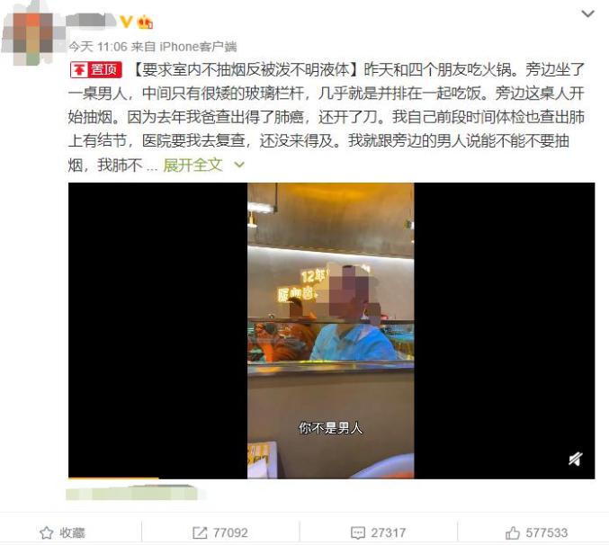 30日上午11时,微博网友“肖美腻”发布了“要求室内不抽烟反被泼不明液体”的文章。