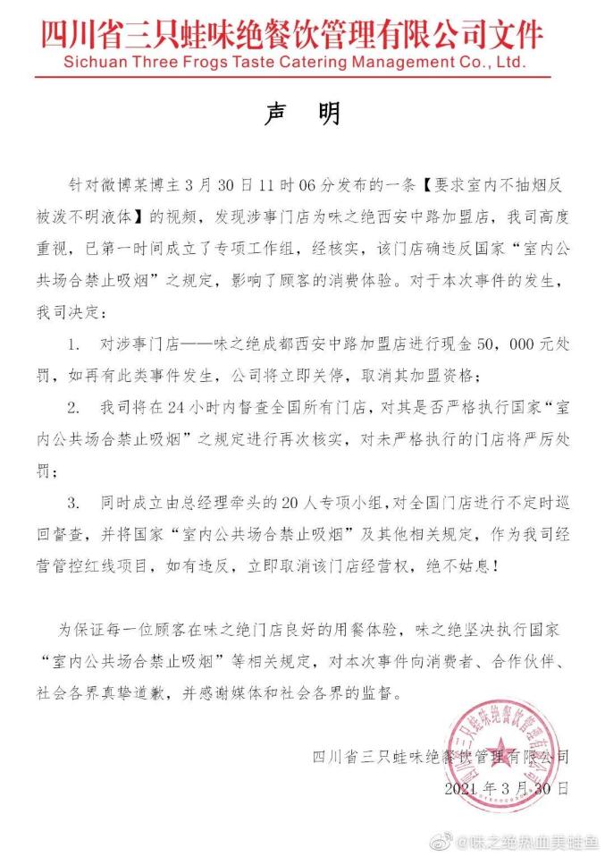 30日傍晚,四川省三只蛙味绝餐饮管理有限公司发布声明,称针对微博某博主3月30日11时06分发布的一条“要求室内不抽烟反被泼不明液体”的视频,发现涉事门店为味之绝西安中路加盟店。该公司高度重视,已第一时间成立了专项工作组。经核实,该门店确违反国家“室内公共场合禁止吸烟”之规定,影响了顾客的消费体验。