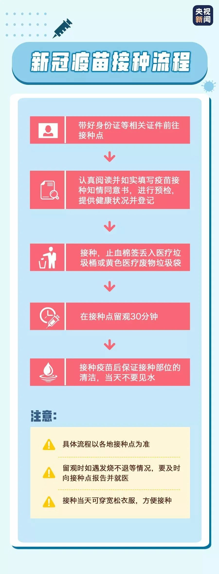 接种后需注意什么?接种期间不要酗酒、剧烈运动,保证充分的睡眠、休息;接种后按压棉签需扔在指定的医疗垃圾桶内,不得带走;如出现发热、皮疹等不适症状时,请及时就医并报告接种单位。