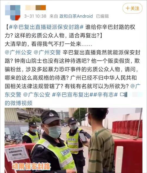 近日,有网友上传视频并表示,3月27日,辛巴团队在位于广州市白云区的辛选直播基地附近直播时,有人员将周边道路封住,过路市民均要接受盘问,而这恰好是“辛巴”复出直播当天。