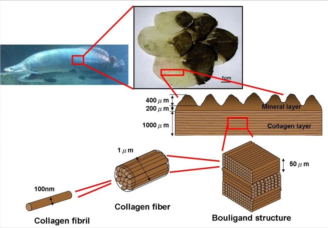 近年来的研究发现,它们的鱼鳞具有一种布林根结构(Bouligand structure)。一拳能打出.22口径长步枪弹的力量的皮皮虾(Stomatopoda)不把自己打崩,靠的也是布林根结构。