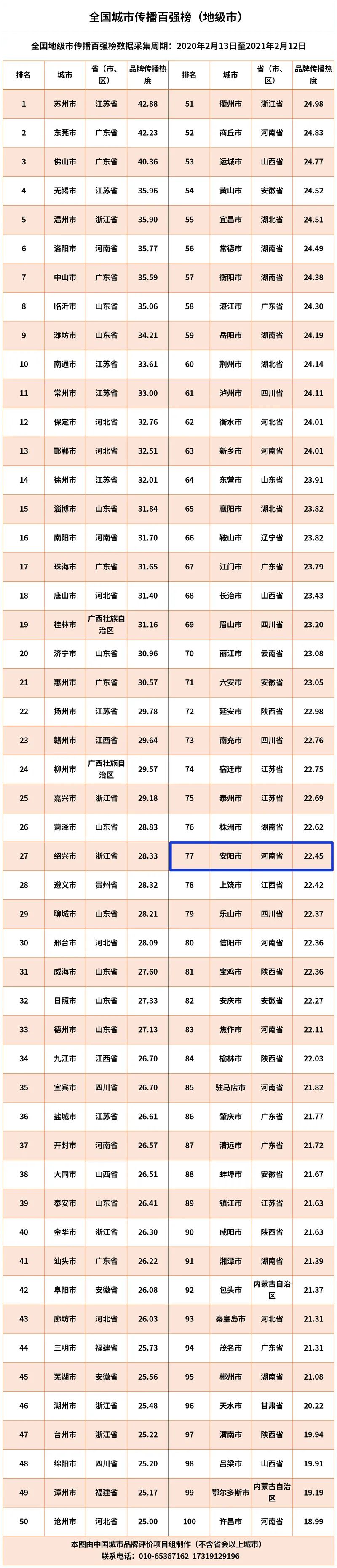 2021全国城市传播热度排名发布会近日在人民日报社举办。中国城市品牌评价项目组、人民日报《中国城市报》社联合清华大学国家形象传播研究中心,根据国家统计局和微热点大数据研究院数据及相关标准,对全国261座地级市(不含省会以上城市)、393座县级市最近一年(2020年2月13日至2021年2月12日)有关数据进行标准化计算,分别发布地级市和县级市传播热度指数排名前100名单。地级市苏州市、东莞市、佛山市、无锡市、温州市、洛阳市、中山市、临沂市、潍坊市、南通市和县级市义乌市、常熟市、晋江市、巢湖市、江阴市、文昌市、敦煌市、浏阳市、张家港市、诸暨市分别占据全国传播百强榜前十名。