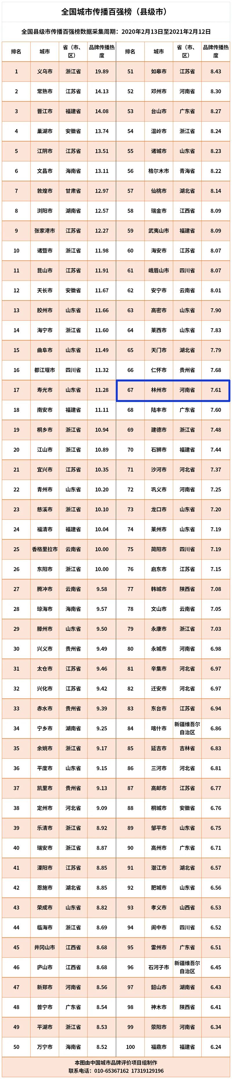 (图片来自:爱林州网)中国城市品牌评价项目组组长、中国城市报总编辑杜英姿介绍,这是市域研究最为权威的排行榜之一,常常成为衡量城市宣传工作的重要参考。传播热度指数是国家标准《品牌评价 城市》37项指标之一,这次发布是为国家品牌日 全国城市品牌评价发布做准备。
