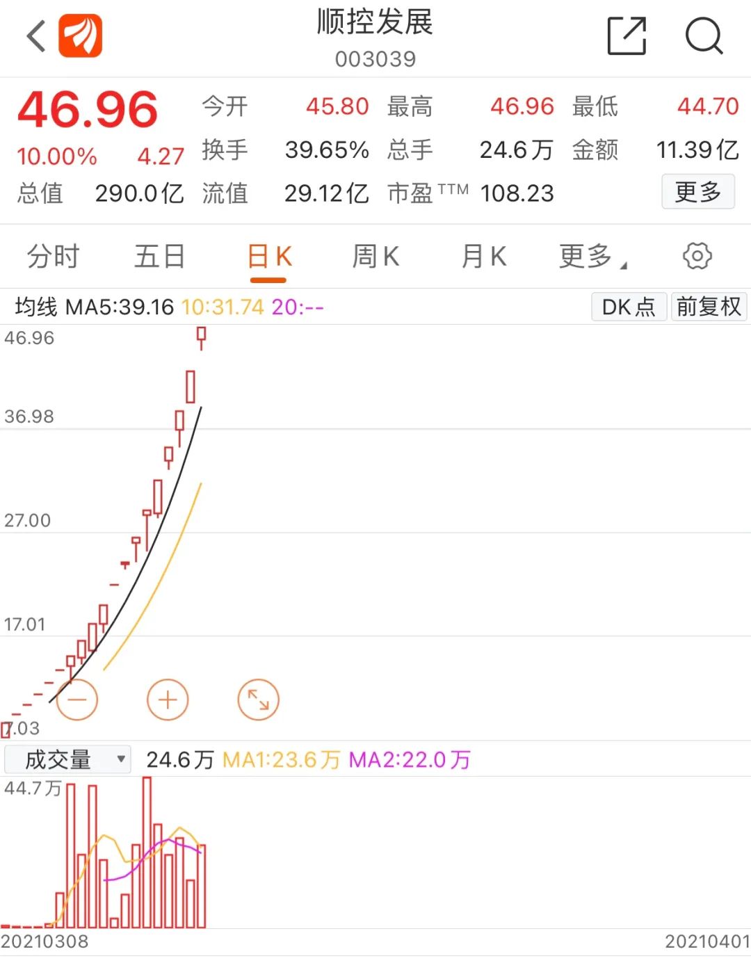 据悉,顺控发展在3月8日以5.86元的发行价格上市,按最新收盘价46.96元计算,累计涨幅高超700%。4月1日,顺控发展再度涨停,自上市以来日线收获18连板(不含上市首日涨停),成为年初至今连板数量最多的个股。