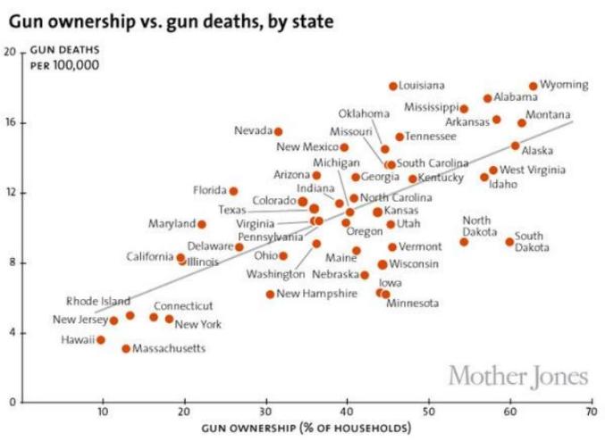 《MotherJones》杂志的这张图反映出了美国各州的枪支拥有率和枪支死亡(包括他杀和自杀)数据,能明显看出,家庭拥有枪支率较多的州,其枪支死亡率也较高。
