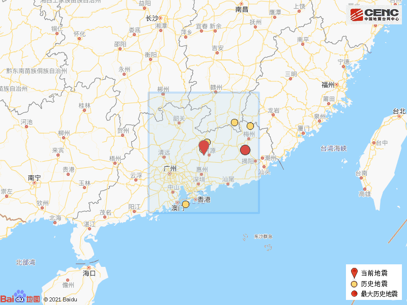 根据中国地震台网速报目录,震中周边200公里内近5年来发生3级以上地震共9次,最大地震分别是2021年4月2日在广东河源市东源县发生的3.7级地震(距离本次震中0公里)和2020年1月20日在广东梅州市兴宁市发生的3.7级地震(距离本次震中154公里),历史地震分布如图。
