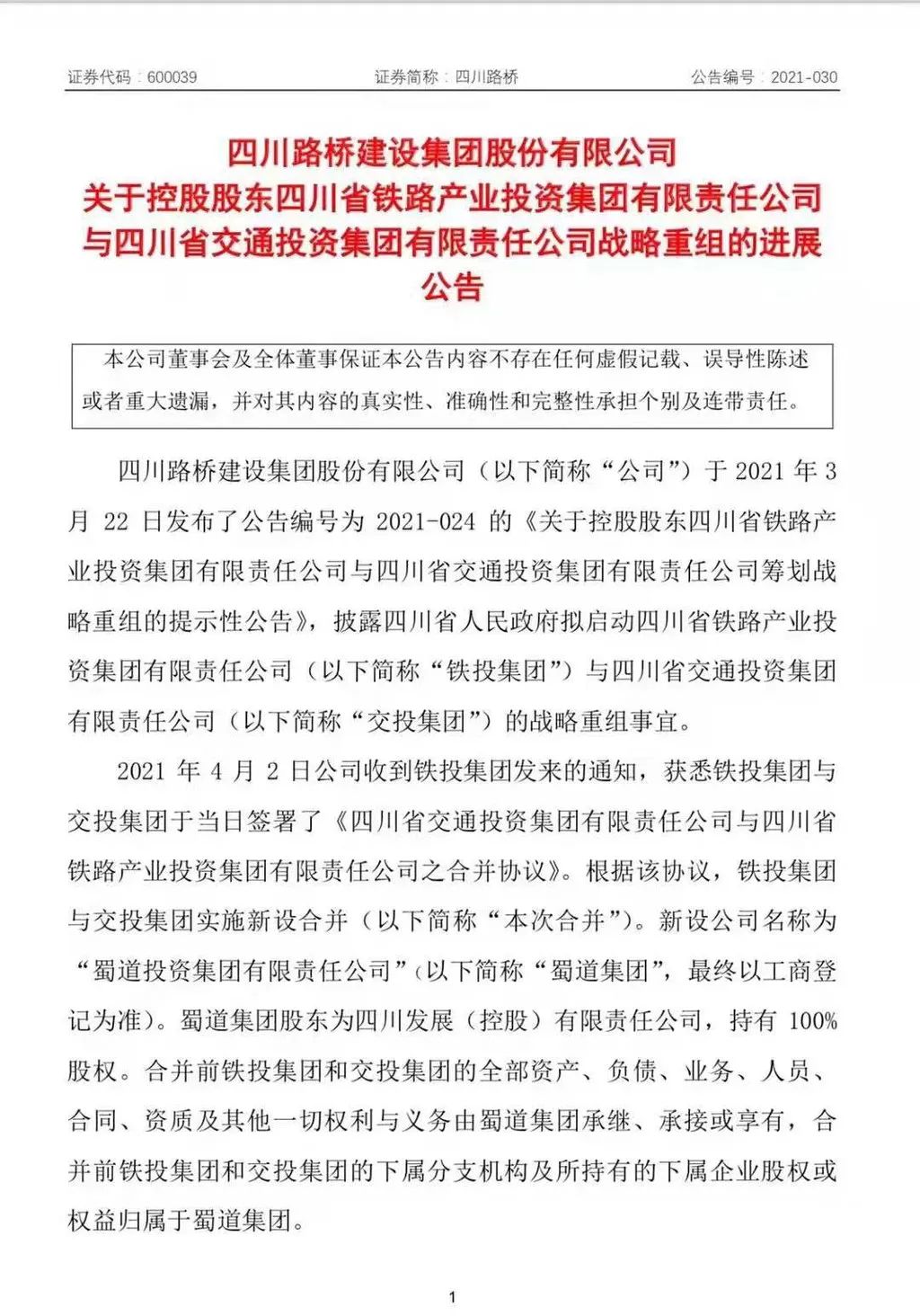 4月2日,四川路桥发布公告,称当天两大投资集团签署了合并协议,新设公司名称为“蜀道投资集团有限责任公司”,简称“蜀道集团”(最终以工商登记为准)。
