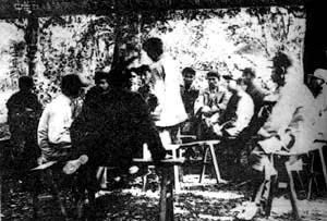 中立讲话者为毛泽东,其右侧第1人为朱德,左起第3人为任弼时。1931年11月7日,中华苏维埃第一次全国代表大会在江西瑞金召开。中央、闽西、湘鄂赣、湘赣、湘鄂西、豫东北、琼崖等各苏区及红军各部均选派代表出席,共610人参加。大会通过了《中华苏维埃共和国宪法大纲》、《中华苏维埃共和国劳动法》、《中华苏维埃共和国关于经济政策的决定》等文件,发表了《中华苏维埃共和国临时政府对外宣言》和《中华苏维埃第一次全国代表大会告全中国人与劳动民众》。大会产生了中华苏维埃共和国临时中央政府,并选出63人为中央执行委员。