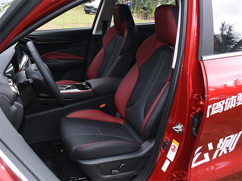 进入车内,冲击感显然没有外观那么强烈。内饰整体造型与布局带有明显的“长安味”。虽然没有采用时下热门的“双联屏”设计,但10英寸全液晶仪表盘+10.25英寸中控大屏的配置在同级中不落下风。黑色内饰+红色饰条的撞色设计算是相当常见的一种构建运动氛围的选择,虽然用料方面只能说是与同级车持平,但整体运动氛围的营造表现不错。