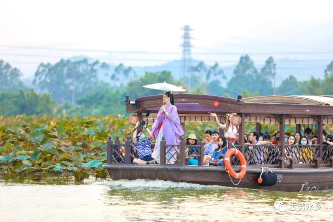 景区供图古劳水乡拥有岭南地区规模最大、分布最集中、保存最完整、极具生态意义的桑基鱼塘、围墩人家人文风貌。横海游梦,是华侨城古劳水乡的网红打卡项目,你可以体验路线全长6公里,游玩时间约40分钟,通过分段式的主题场景体验领略“做一天水乡人”的趣味,伴随着渔夫的高声呼喊和击鼓声,丰富的水上景点以行进式视野。