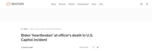 路透社报道截图拜登称,自己不断收到有关这起事故的简报,并持续关注调查进展。拜登还表示,他已下令白宫降半旗向埃文斯致哀。