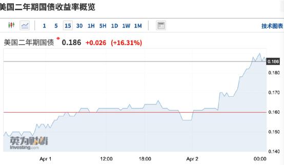 2年期美债收益率一度升至0.19%,创去年6月以来新高。