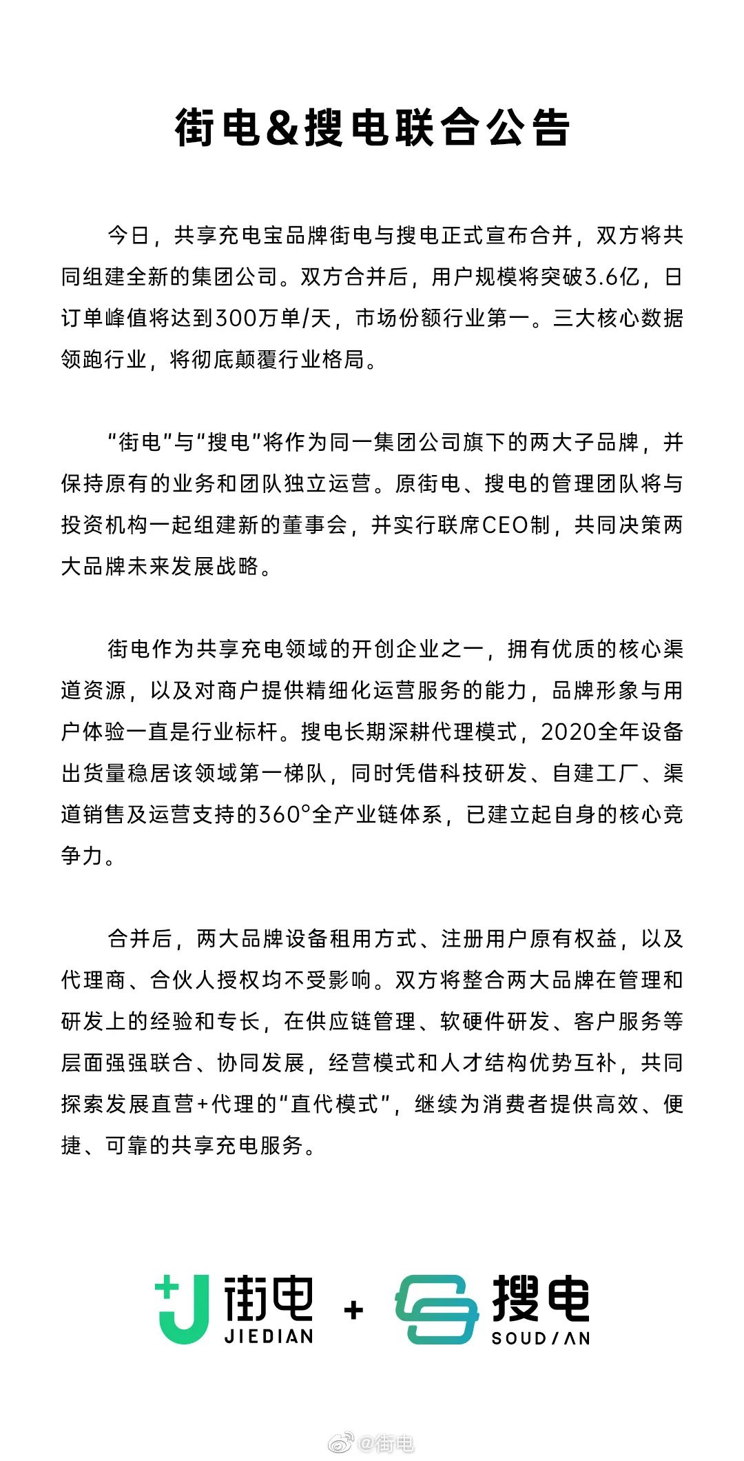 就在怪兽上市前夕,这个行业发生了另一场震动——街电与搜电宣布正式合并,双方将共同组建全新的集团公司。
