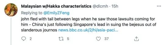 网友Malaysian w/Hakka characteristics进一步解释道:沙磊是看到(新疆民众)对他的指控,夹着尾巴逃走了——中国只是在效仿之前新加坡因BBC诽谤该国国父而将其起诉的做法。