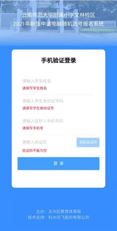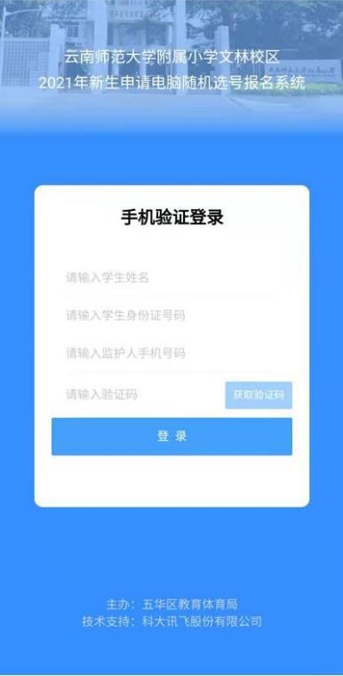 法定监护人使用浏览器(推荐使用谷歌浏览器),输入https://kmwh.jyyun.com/kmwh-reporting/#/login网址,或使用手机微信、支付宝、手机浏览器扫描上方二维码,进入“云南师范大学附属小学文林校区2021年新生申请电脑随机选号报名系统”,如下图所示: