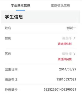 (1)选择学生的性别、民族,填写法定监护人的联系电话,系统会根据手机验证登录时填写的信息自动生成出生日期及身份证号码,如下图所示: