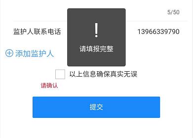 每条信息均填报完成才可提交,请法定监护人如实填写报名系统中的所有信息,保证信息真实、有效。填写虚假信息、提供伪造证件,一经查实,取消报名及入学资格并追究法律责任。检查完毕提交后,系统会给登录系统的法定监护人手机号发送一条短信,告知法定监护人再次登录系统完善户口及房产信息的时间,法定监护人必须严格按照短信的提示在规定时间内输入孩子的身份证号码登录系统进行信息完善,逾期将失去完善信息资格,视为报名失败。如下图所示: