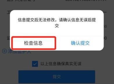 3.核对信息与提交勾选‘以上信息确保真实无误’后才可提交,点击【提交】系统会提示填写人核对信息,点击【检查信息】即可检查当前填报的信息,如下图所示:
