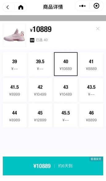 又如李宁韦德之道7 wow7 The Moment超越限量款,40码的售价为10889元,相比发售价1699元涨了近6.4倍。同时,这款鞋最近购买数据达271条,截至今早前刚成交一笔44码的鞋,成交价为8989元。