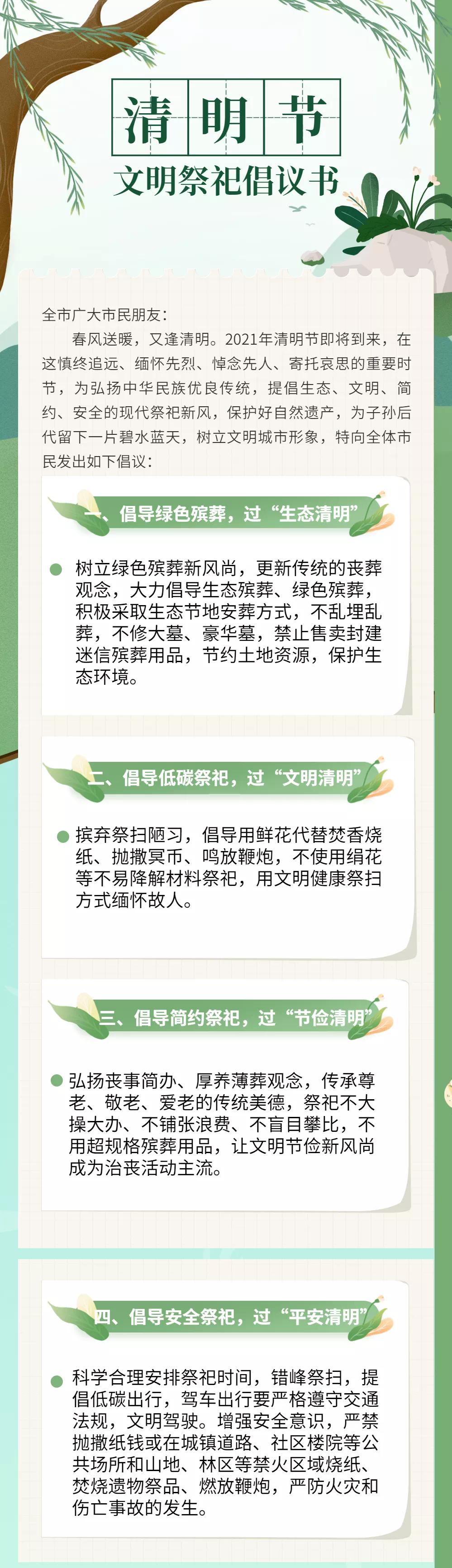 清明节来临之际,为弘扬中华民族优良传统,提倡生态、文明、简约、安全的现代祭祀新风,团市委积极发布“文明祭扫倡议书”,号召我市团员青年过“生态清明、文明清明、节俭清明、平安清明”。