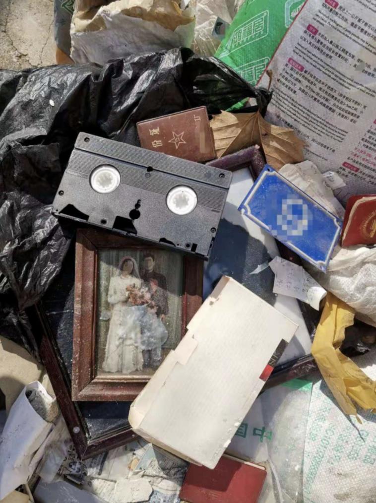 在网友分享的照片上,正是被当成垃圾扔掉的老大爷的遗物。这些“垃圾”中,包括老人的旧照片、旧磁带、旧证件,其中还有一张珍贵的结婚照。这张结婚照中,年轻的新郎和捧花披纱的新娘并排站在一起,整个画面温馨而美好,这是一个家庭的起点,现在却也成了一个家庭消散的证据。