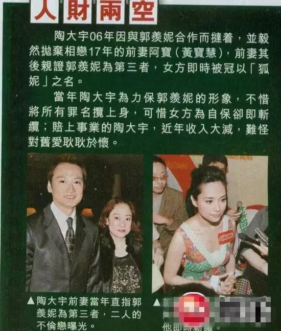 更要命的是,陶大宇跟老婆离婚后,没多久就跟郭羡妮闹掰,转头又跟前妻复婚了。渣男浪子回头为了洗白自己,第一件事就是跟太太一起发大字报骂郭羡妮。