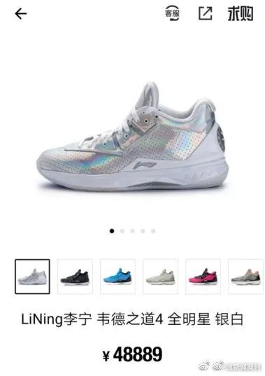 此前有媒体爆出,在某App上,参考发售价1499元 的李宁韦德之道4银白款,页面显示仅42码有货,且售价高达48889元, 涨幅高达31倍。