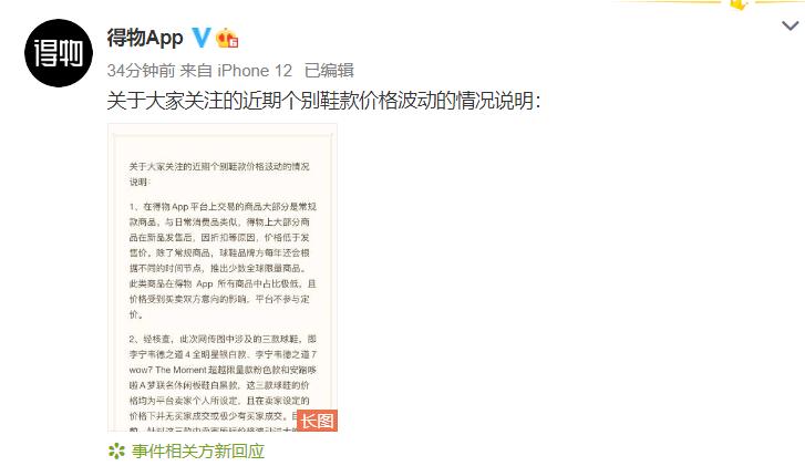 4月6日上午,得物APP在官微发布“关于大家关注的近期个别鞋款价格波动的情况说明”。