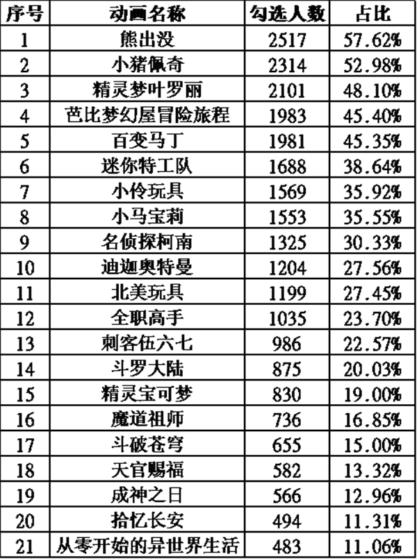 注:动画片的选择参考前期“您的小孩平时喜欢看哪部动画片”的调查结果选定,共收集到4368条有效数据(多选项)