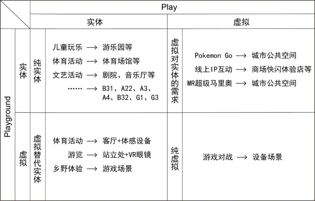 技术的发展颠覆了玩乐行为与空间支撑在实体与虚拟的对应关系,其关系可分为4种类型(图7):纯实体、纯虚拟、虚拟对实体的需求、虚拟替代实体。其中,第3与第4种类型是城市空间规划与设计过程中需着重关注的方面。虚拟对实体的替代使得人们能够在小空间内完成大场景的视觉或身体上的玩乐体验,虚拟对实体的需求则符合人们对虚拟空间游戏体验的追求,于大空间中完成与屏幕内虚拟场景的互动。Play与Playground在实体与虚拟上的错位关系,共同影响未来城市公共空间的配置与设计。