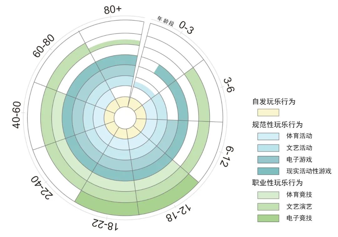 分析玩乐行为在人类各个年龄段的差异体现,玩乐是人与生俱来的持续需求。通过制度限定与规范、职业化的演进,玩乐行为获得正当性。传统玩乐行为需要实体空间的支撑,电子、虚拟游戏在打破这一传统后,随着技术的发展又促使虚拟空间的玩乐行为在实体空间卷土重来,不一样的是此时实体空间行为为配合虚拟需求的副产品。线上虚拟空间玩乐行为将对未来实体空间规划和设计产生巨大的影响。除了因时代不同而导致玩乐行为的代际差异外,处于同时代的人群也因年龄段的不同而产生玩乐空间需求的异化。