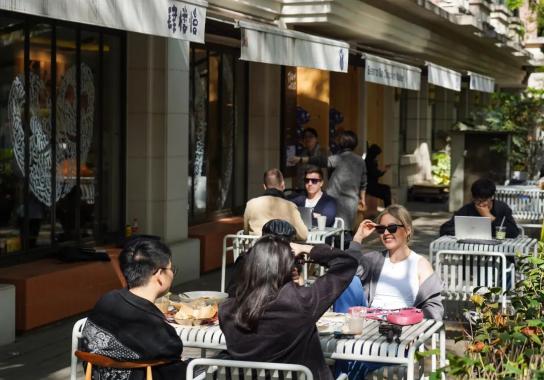 春光正好,市民在愚园路上享受咖啡时光清明小长假,愚园路人气十足。飞哟画廊、露地怪物冰屋大排长队;愚园百货门口,不少游客前来拍照打卡,里面的网红咖啡店Akimbo,坐得满满当当。这条充满生活气息的马路,热闹但不拥挤,每家小店都个性十足、各有精彩,其中众多具有文艺气质和街区烟火的咖啡店,是一道独特的风景,和愚园路之间彼此成就。