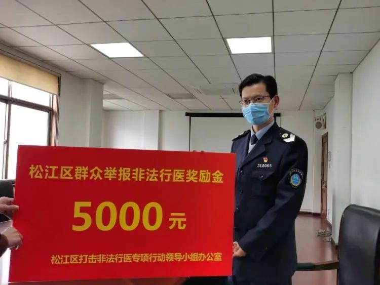近日,有一位热心市民举报非法行医,并领取到了奖励金5000元,这也是我区首次发放非法行医有奖举报的最高金额。我向大家介绍一下,今年1月,贾先生通过镇相关部门致电松江区卫生健康委监督所反映,某出租屋内有人涉嫌非法行医。接报后,卫生监督执法人员联合公安民警等立即开展执法检查,当场查获非法行医人刘某某(化名)正在从事内科输液诊疗活动,现场查获大量药品和医疗器械。经调查确认,非法行医人刘某某在该地址开展诊疗活动4个多月,刘某某对违法行为供认不讳。根据《基本医疗卫生与健康促进法》的规定,依法对其作出罚没12.51万元的行政处罚。怎料数天后复查,刘某某不知悔改,仍在从事非法行医相关活动,松江区卫生健康行政部门当场依法作出罚款20万元的处罚,因其涉嫌非法行医罪,刘某某被移送公安机关追究刑事责任。根据该办法的相关规定:举报事项经查实,罚没款合计超过10万元的,或举报的事项构成刑事犯罪、依法移送司法部门并已追究刑事责任的,给予3000-5000元的奖励。最后,给予奖励5000元。
