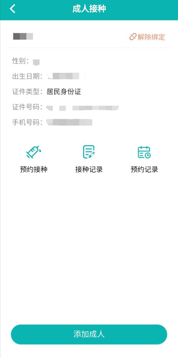 第三步:点击“预约接种”,如未显示个人信息,需先点击下侧“添加成人”提交信息。