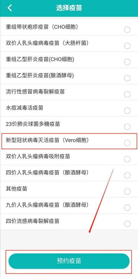 第四步:选择“新型冠状病毒灭活疫苗(Vero细胞)”。