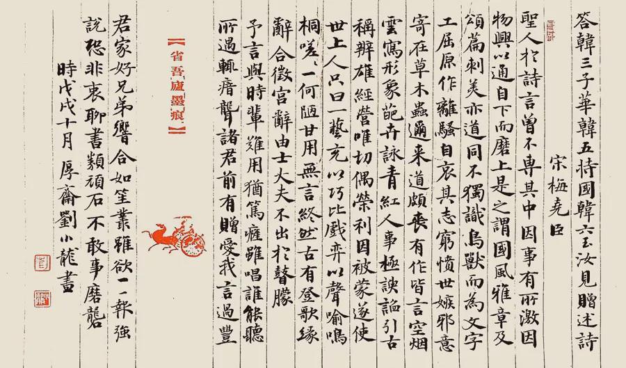 落款盖印之下,不可再题字,。印章上下有字掣肘,就失去自然现象。