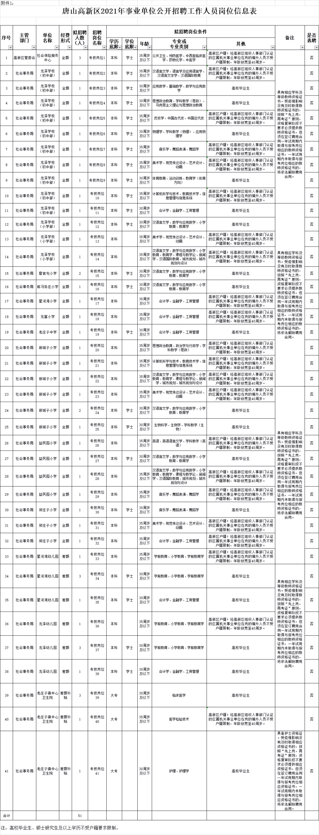 根据《河北省事业单位公开招聘工作人员暂行办法》(冀人社发〔2011〕9号)文件要求,按照市政府领导批示精神,我区拟面向社会为高新区社会保险服务中心、区属中小学、老庄子镇中心卫生院公开招聘51名事业编制专业技术人员,其中为高新区社会保险服务中心招聘3名,为区属中小学招聘43名,为老庄子镇中心卫生院招聘5名,现将有关事项公告如下: