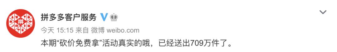 4月6日,@拼多多客户服务 对此表示,本期“砍价免费拿”活动真实,已送出709万件。