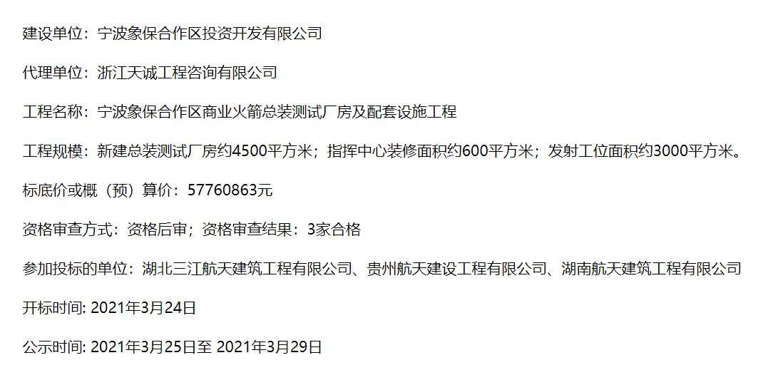 商业火箭总装测试厂房预计今年7月整体竣工验收。宁波保税区管理委员会今年4月初发布《宁波象保合作区商业火箭总装测试厂房及配套设施工程(监理)预中标公示》显示,在工程规模上,新建总装测试厂房约4500平方米,指挥中心装修面积约600平方米,发射工位面积约3000平方米,整体竣工验收时间为今年7月31日前,中国航天科工所属湖南航天建筑工程有限公司投标评分排名第一。