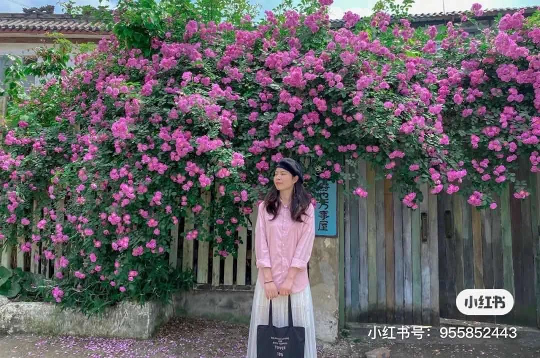 除了湿地公园,还有一处鲟也·万事屋的私宅,门口也有一大片非常美的蔷薇花。相比于公园,这里的花颜色更深一些,色彩更浓郁、饱和度更高,只管尽情穿上小裙子来拍拍拍。