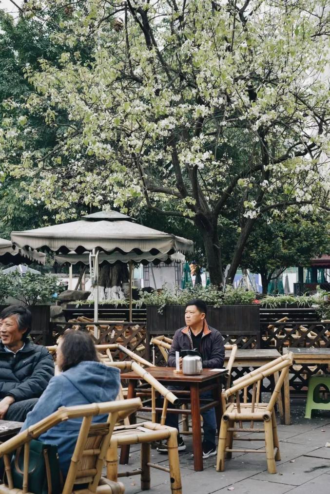 茶馆临河而建,老成都人在花树下喝茶打牌,小孩子在公园里随心所欲地淘气,一直喝到太阳都落下去,茶都喝白了,一帮人才慢慢悠悠地离去。