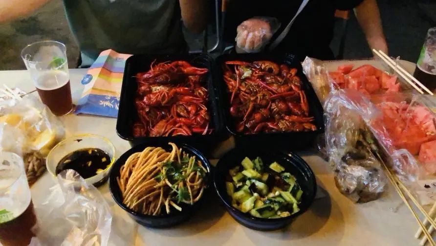 从接到他要到汉的通知到我们坐在万松园的街头吃上第一口小龙虾,也不过2个小时的事情。这2个小时里,放下手头安排跑来见他的不只有我,还有住在距离城区30公里远、常年深夜加班到头秃的年轻设计师小孟;等孩子睡着才出门的年轻妈妈油油;匆忙结束上一场酒局赶来临时加场的武汉老炮余老师和平时不太可能随时联系上、神出鬼没的月月,大家的热情被王大的突然到来给调动了起来。在大理时大家任王大细心照料吃喝,他到了武汉,那这第一顿必须是怎么吃爽怎么来。