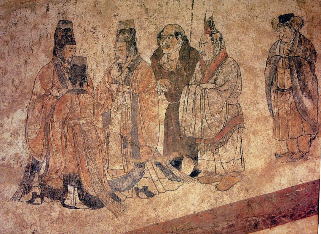 章怀太子墓《客使图》壁画在唐朝,除了专门的翻译机构——中书省四方馆、鸿胪寺译场里的“舌人”“译人”以外,民间会说外语的人很多。因为需要与各国人物以及外来民族进行交往,所以外语非常重要。安禄山为何能迅速地升官?因为他会“六蕃”(六种语言),在当时是一个从事北方边关商贸中介的人才。但最后他野心膨胀,对抗朝廷发动叛乱,造成了社会动荡与国家衰落,那是后话了。总之,在唐朝这样一个世界性的国家里,语言的交流也是非常重要的。