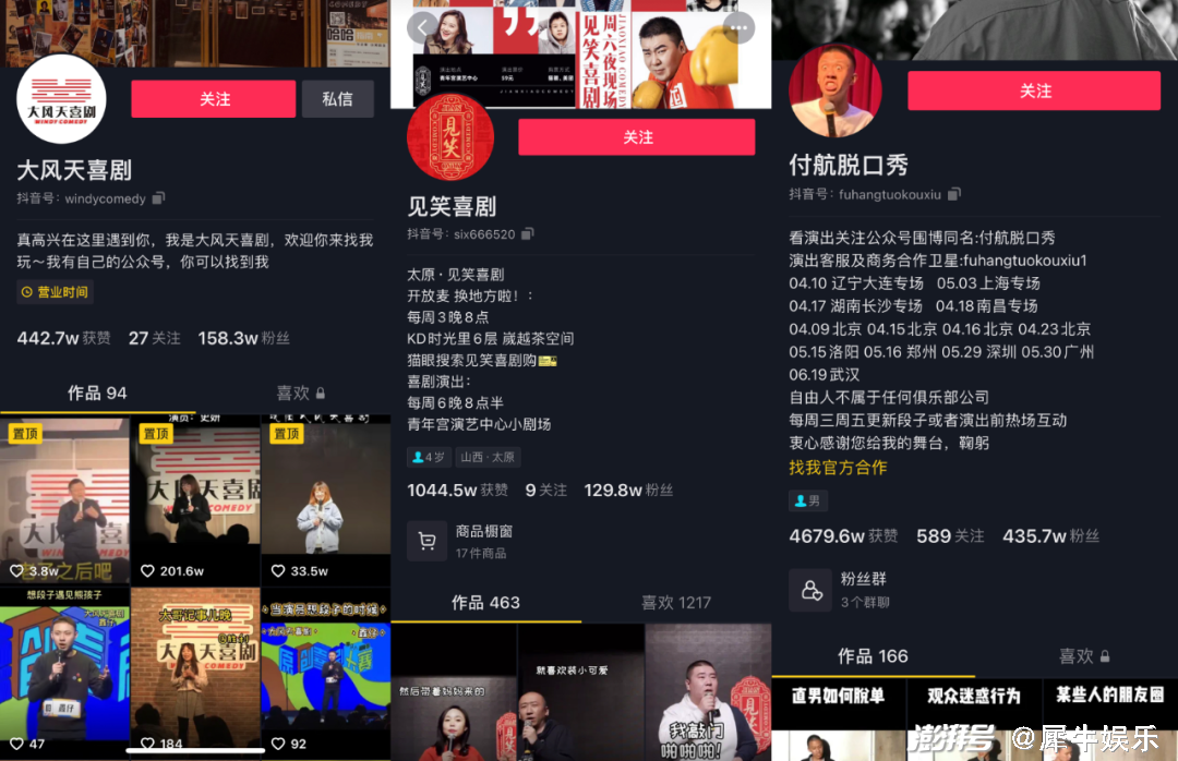 短视频也为脱口秀开拓了全新可能。随各类厂牌入驻,小圈子文化被搬上亿级流量平台,年轻态喜剧很契合短视频的碎片传播逻辑,它对演出市场的带动无可估量。沈阳大风天喜剧、太原见笑喜剧等地方厂牌在抖音上已积累百万、千万级粉丝,持续带热地方市场,北脱的付航更是凭疯狗人设在抖音圈粉436.7W,一人拉升北脱线下演出市场的上限。