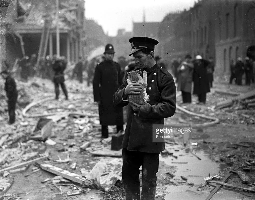 伦敦大轰炸后 军人捡起一只无家可归的猫一幕战争期间,很多部队也会在战壕中养猫。