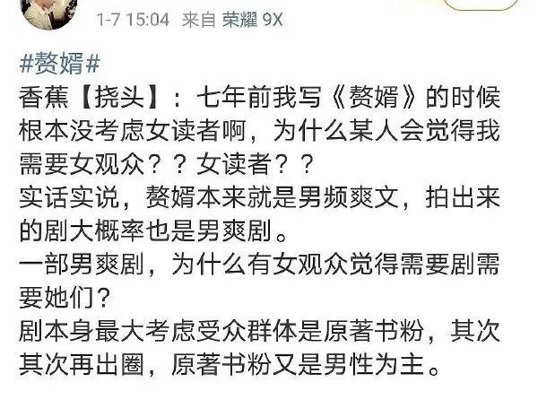 《赘婿》播出之前,原著作者曾放出“为什么会觉得我需要女观众?女读者?”的厥词。现在想想,这样短视而冒犯的言论不仅可笑,还把问题中的性别主体给弄反了。