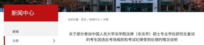 全文如下(滑动查看):近日,部分参加中国人民大学法学院法律(非法学)硕士专业学位研究生复试的考生因违反考场规则和考试纪律受到处理,引发网民关注,现将有关情况说明如下: